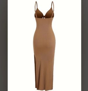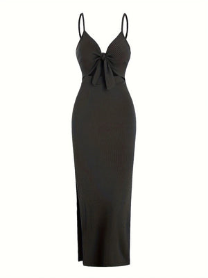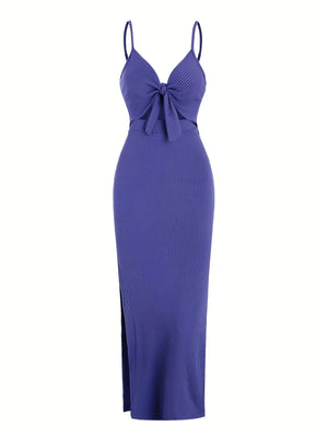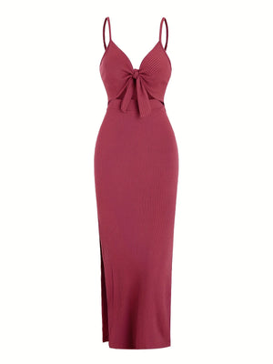 The Aria Split Long Dress combines elegance and comfort with its sleeveless design and smooth knit fabric. Featuring a flattering midi length and a stylish tie knot detail, this dress offers a refined silhouette while allowing ease of movement. Its soft texture ensures a comfortable wear, making it an excellent choice for both casual and dressier occasions.
