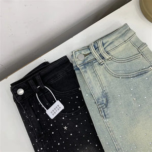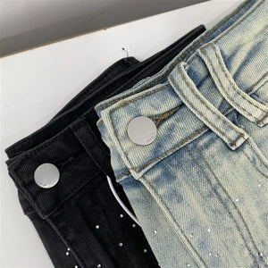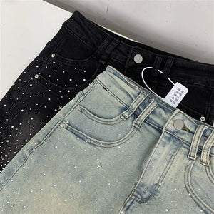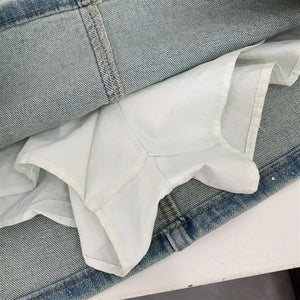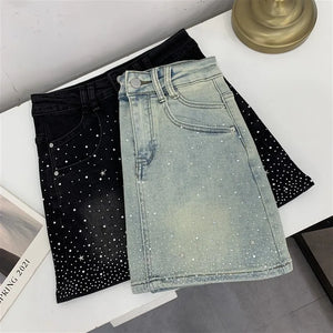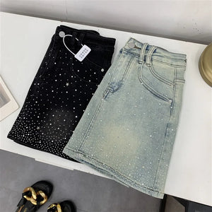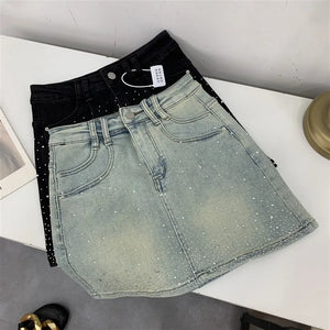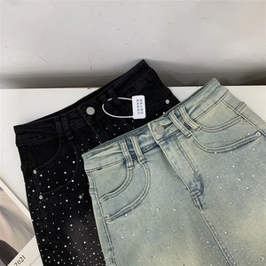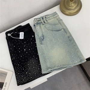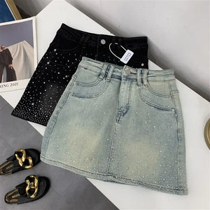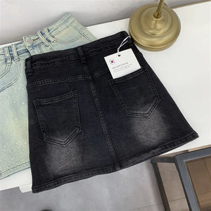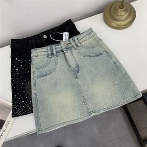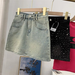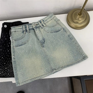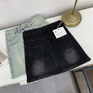 Elevate your style with the Diva High-Waisted Mini Skirt, featuring a chic denim design adorned with subtle rhinestone embellishments. This tailored piece offers a flattering high-waisted fit that enhances your silhouette while maintaining a tasteful balance between elegance and modern edge. Perfect for sophisticated occasions or refined casual wear, it promises both comfort and style in a new, sensibly designed silhouette.